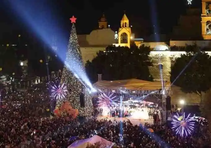 Hàng ngàn người từ Bờ Tây và từ phía Do Thái đã tập trung tại Quảng trường Máng Cỏ ở Bethlehem, reo hò khi cây thông cao 20 mét, được trang trí bằng màu đỏ và vàng, được thắp sáng ngay trước 8 giờ tối thứ Bảy (ngày 6 tháng 12) trong bối cảnh lệnh ngừng bắn mong manh ở Gaza.